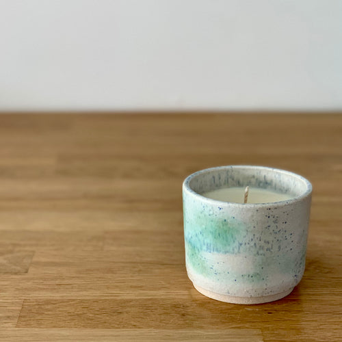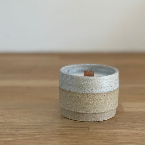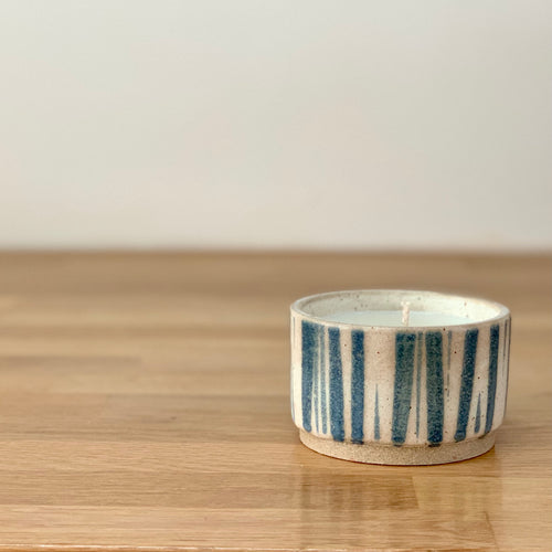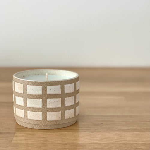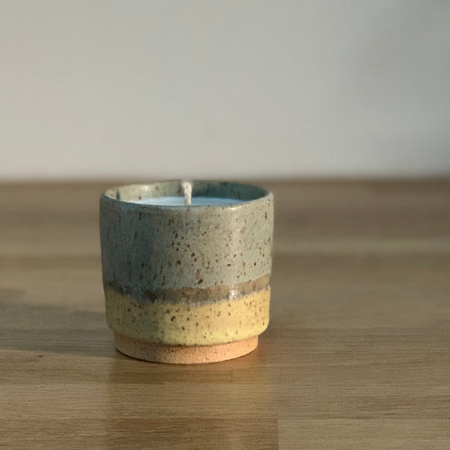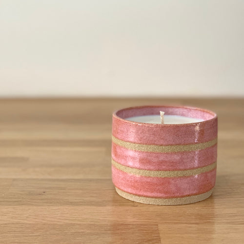 HAND POURED SOY WAX IN A CUSTOM HANDMADE POT THAT CAN BE REUSED AFTER CANDLE BURNS THROUGH.