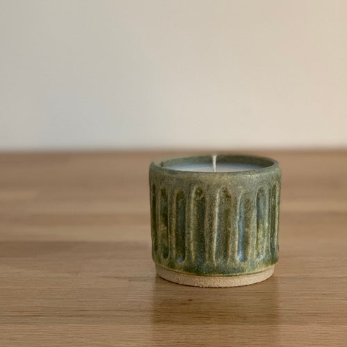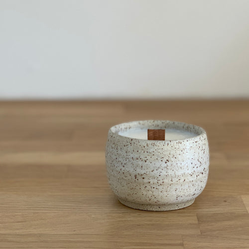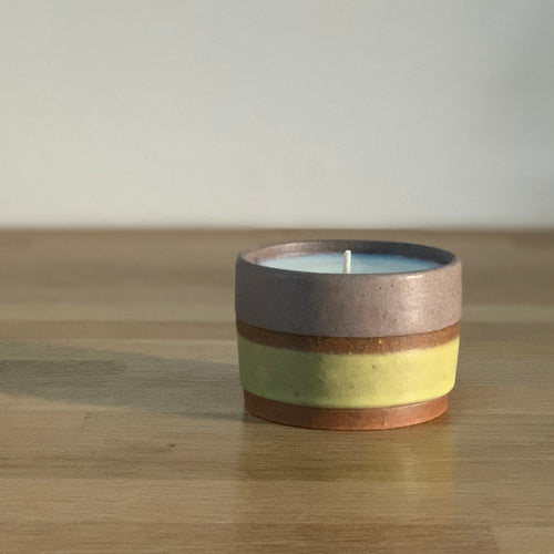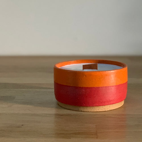 HAND POURED SOY WAX IN A CUSTOM HANDMADE POT THAT CAN BE REUSED AFTER CANDLE BURNS THROUGH.