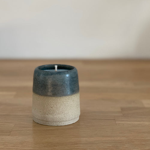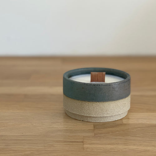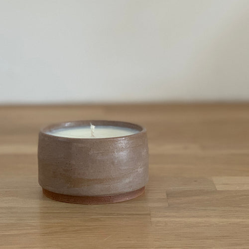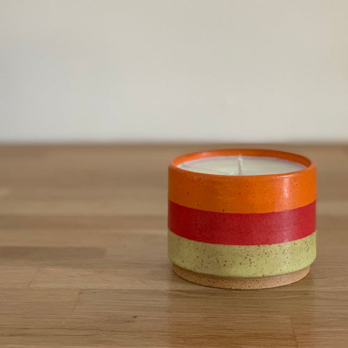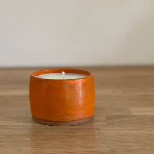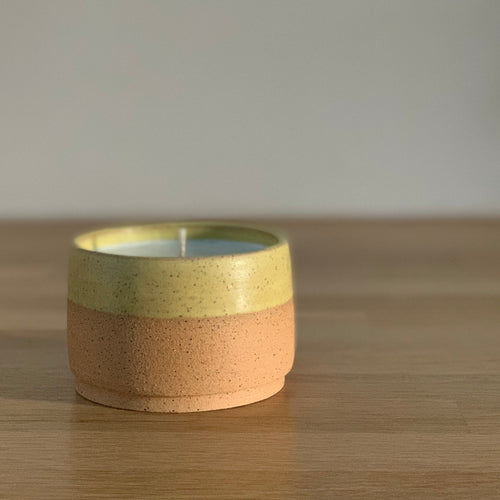 HAND POURED SOY WAX IN A CUSTOM HANDMADE POT THAT CAN BE REUSED AFTER CANDLE BURNS THROUGH.